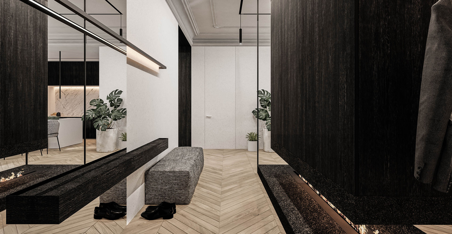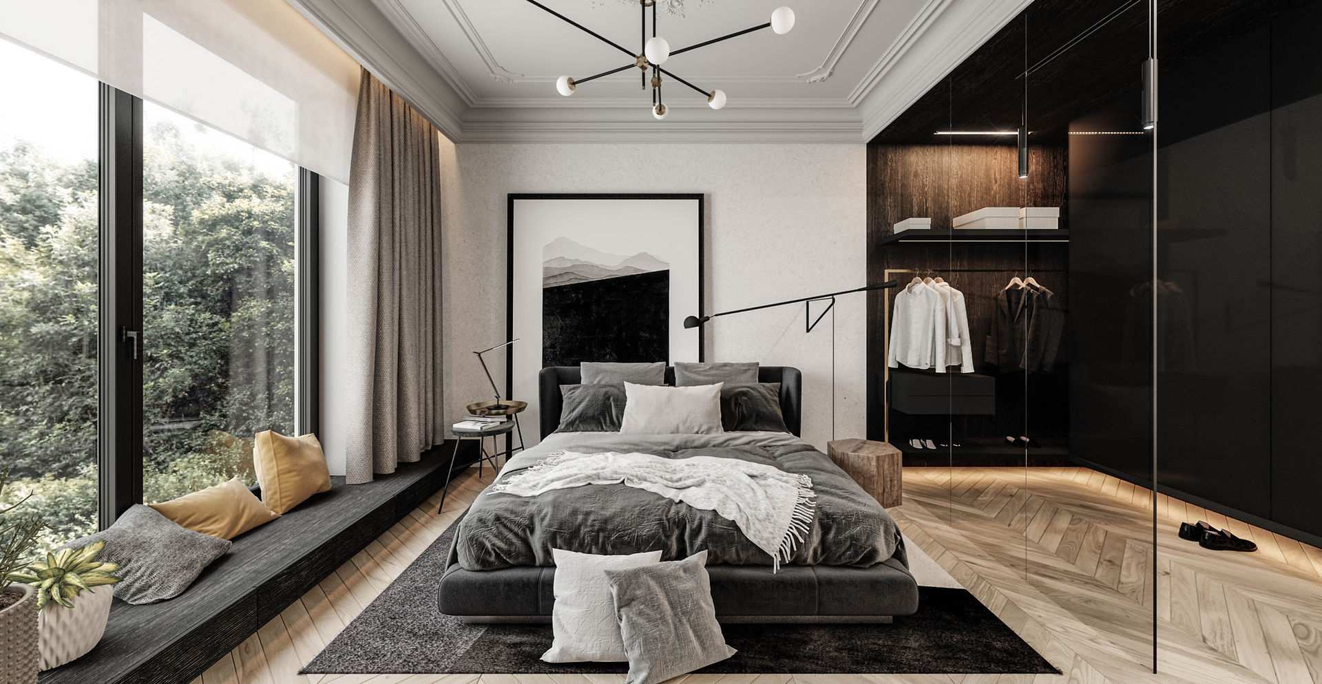 Stumetrowe mieszkanie w nadbudowie kamienicy ogromnymi oknami otwiera się na okoliczną zieleń. Ponieważ apartament należy do singla, zaproponowaliśmy wzajemne otwarcie na siebie także wnętrz. Inspiracji dostarczyły nam domy japońskie, których pomieszczenia w zależności od potrzeb płynnie łączą się lub dzielą. W naszym projekcie obok drzwi przesuwnych służy temu celowi szkło inteligentne – na życzenie przezierne albo mleczne. Z dziedzictwem Japonii łączy się też waga przywiązana do detalu. Szczególne znaczenie w projekcie ma wykorzystanie szczotkowanego i czernionego drewna, przypominającego tradycyjny opalany cedr yakisugi. Staraliśmy się, by całość emanowała harmonią. Poszukiwaliśmy jej w zastosowaniu naturalnych materiałów i spokojnej gamy kolorów, a pod względem stylistyki – w równowadze starego z nowym. Do długiej historii budynku nawiązuje bogata sztukateryjna dekoracja na suficie. Pozostałe formy, modernistyczne, mają w sobie ponadczasową prostotę.